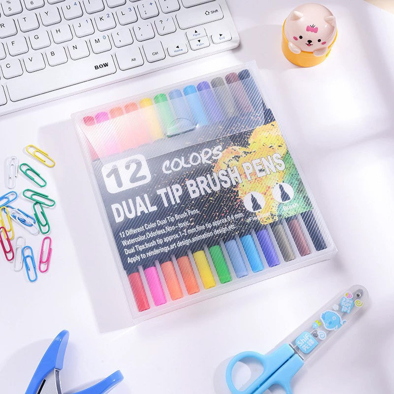 Bring your child’s creativity to life with this premium dual-tip watercolor pen set — designed for doodling, comics, lettering, and school art projects. Each marker features a flexible brush tip (1–2mm) for smooth strokes and a fine tip (0.4mm) for sharp outlines, making it perfect for beginners and young artists. Safe, washable, smudge-free, and available in 12 or 36 vibrant colors, this set is a must-have for journaling, sketching, and creative learning.